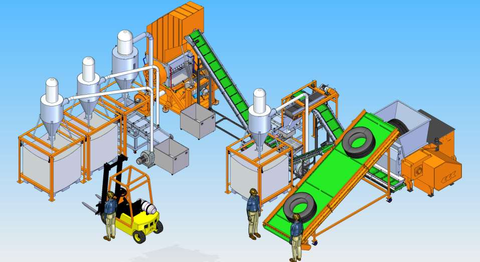 用于廢舊輪胎的回收利用,可將整只廢輪胎分解,并分離出膠粒、鋼絲、纖維,使各種物料可再回收得到利用。