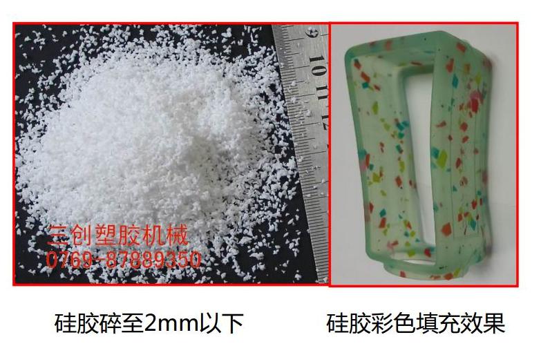 硅膠粉碎機:可粉碎硅膠最小至2mm以下,使無法回爐再利用的硅膠材料,經(jīng)粉碎后可再次用于模具制作,或用于花色添加。
